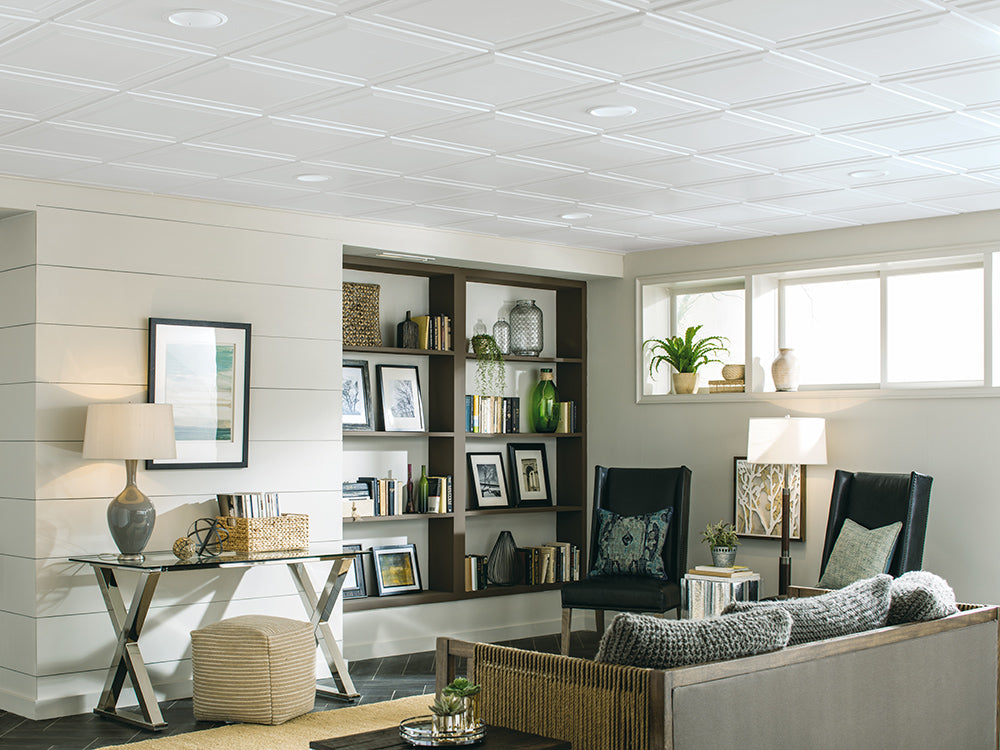 For lower ceilings, try simpler designs, and opt for ceiling types that don’t eat up extra head space. To visually enlarge this space, stay with lighter-toned finishes and lots of bright lighting or natural light if you have it. Incorporate a wood-look plank for subtle interest.